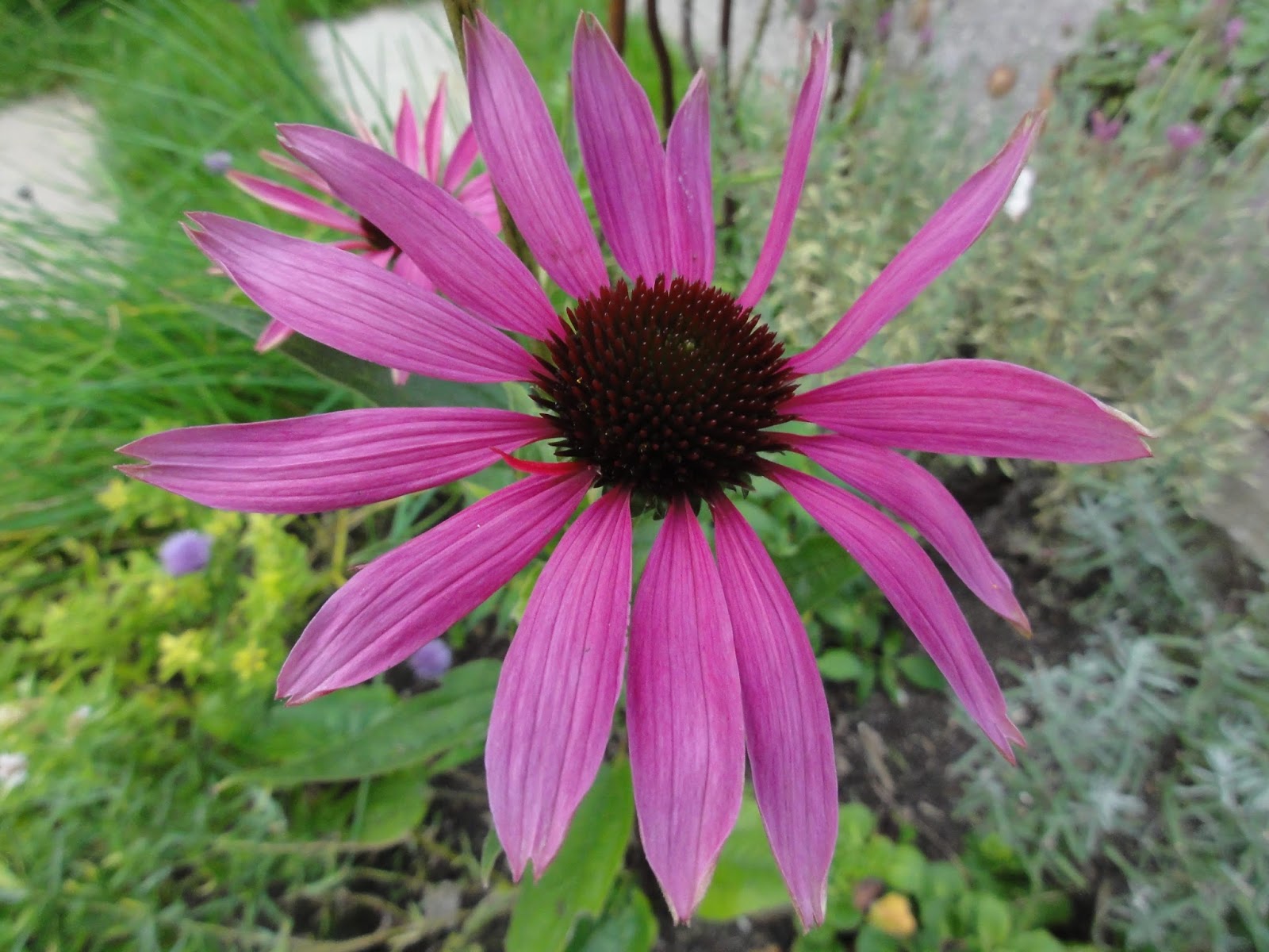 Flowering in the herb border is Origanum amanum and Echinacea purpurea ‘Rubinstern’.