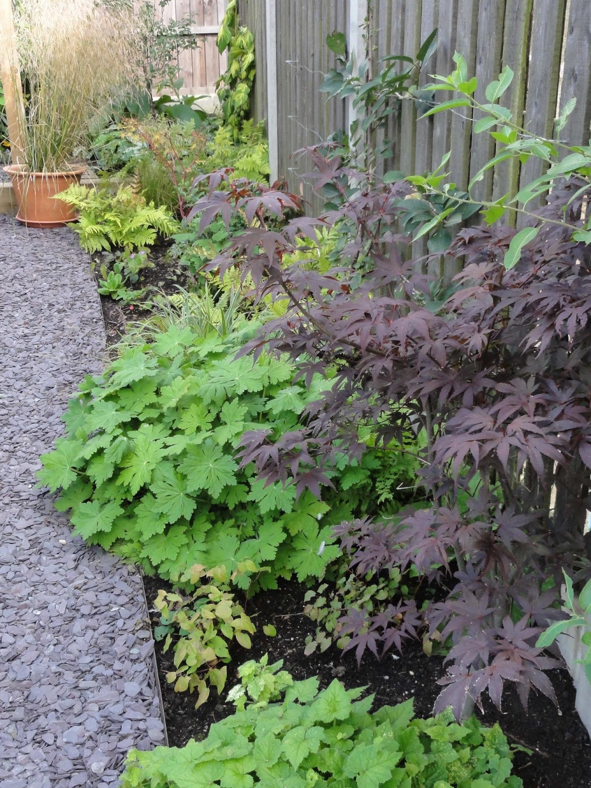 I do love the delicate papery petals of Geranium nodosum ‘Clos du Coudray’, but you have to go looking for it. Which is, of course, no bad thing, it just would be nice to have a couple of flowering plants standing out when you look at it from further away.