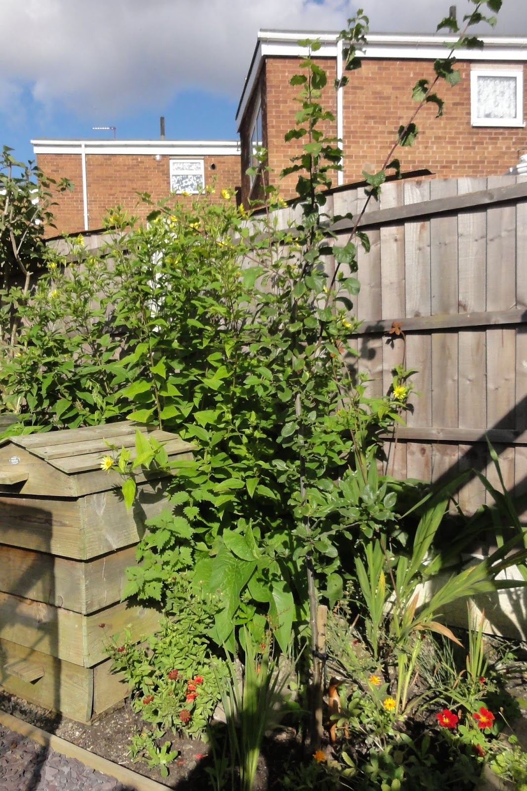 The greengage tree is really taking off now and send up lots of new growth, particularly since I pruned it apical bud at the beginning of the month to open it up more. It is there, it’s just that Helianthus ‘Lemon Queen’ behind it is being a bit of a bully.