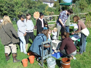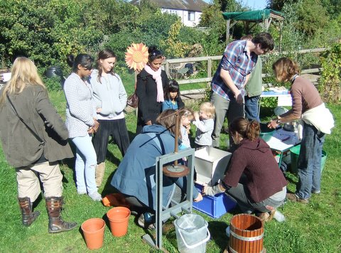 One of the most successful parts of the day was making apple juice. Lots of people brought apples from their gardens and allotments, and we were kindly loaned the use of a ‘scrattle’ and press from Braziers Park.