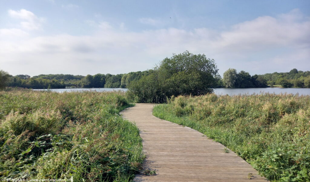 Early August, a boardwalk in the middle stretching into the distance. On either side are green reeds and grasses, and some trees on the right. In the middle distance is a building, which is the lake's cafe.